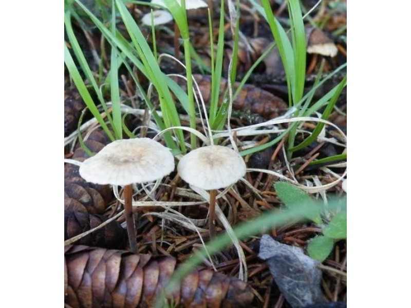 Чесночный гриб (Marasmius scorodonius) потому так и называется, что пахнет чесноком. Сильно и ярко. Грибок сам маленький и хиленький, но растет кучно, очень часто - кругами. Поэтому можно сразу собрать целую охапку.