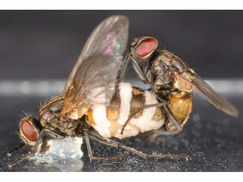 И здоровые мухи-самцы очень реагируют на скорбные останки былых подружек. Нет, не то что вы подумали - не скорбят. И даже не льют скупые мужские слезы. А очень активно начинают ... совокупляться с этими меховыми остатками.