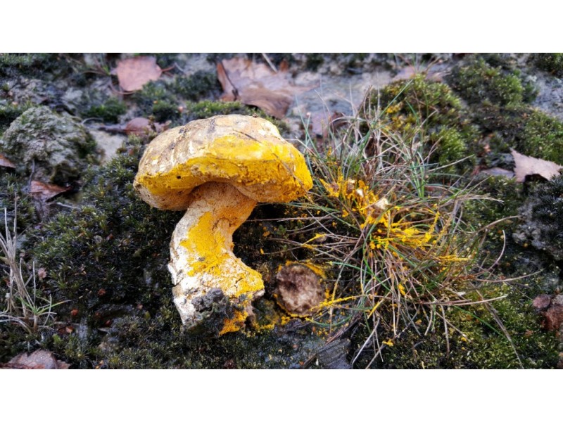 Правда , не один. Там - два гриба. Один - боровик, а второй гриб - гипомицес золотистоспоровый (Hypomyces chrysospermus).